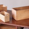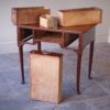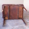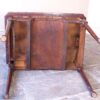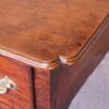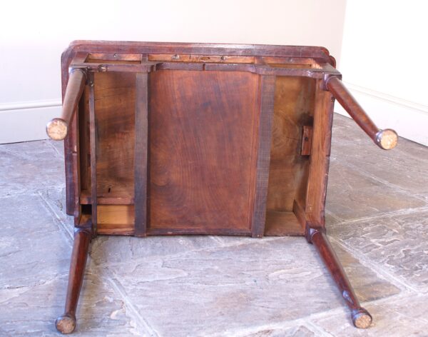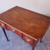 Featuring one long drawer and two shorter ones, it retains the original brass handles, shaped side rails, and turned pad feet. The outer drawers have sprung wooden locks to the side, and a secret drawer is hidden at the back of the left-hand drawer.
