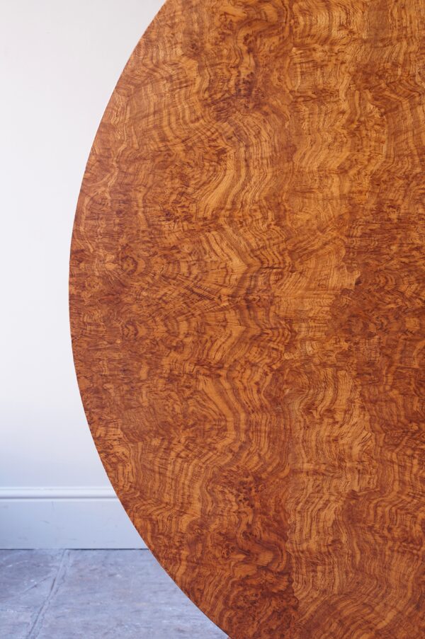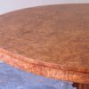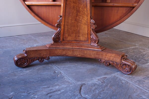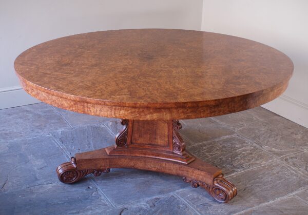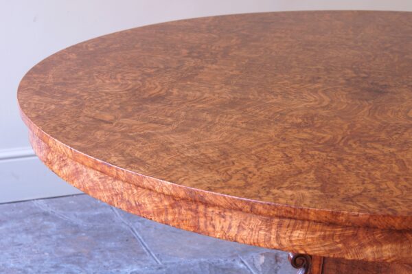 This exceptional 19th Century oak centre table boasts a wonderfully figured circular tilt top raised on a triform base with scroll feet and countersunk castors. Pollard Oak has been masterfully employed to create a striking visual effect on this substantial Regency centre table. Conceived in the Greek Revival style popularised by Thomas Hope and championed by George Smith, this table exhibits a refined form that places emphasis on the highly decorative native veneers.