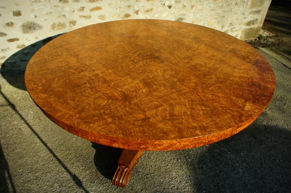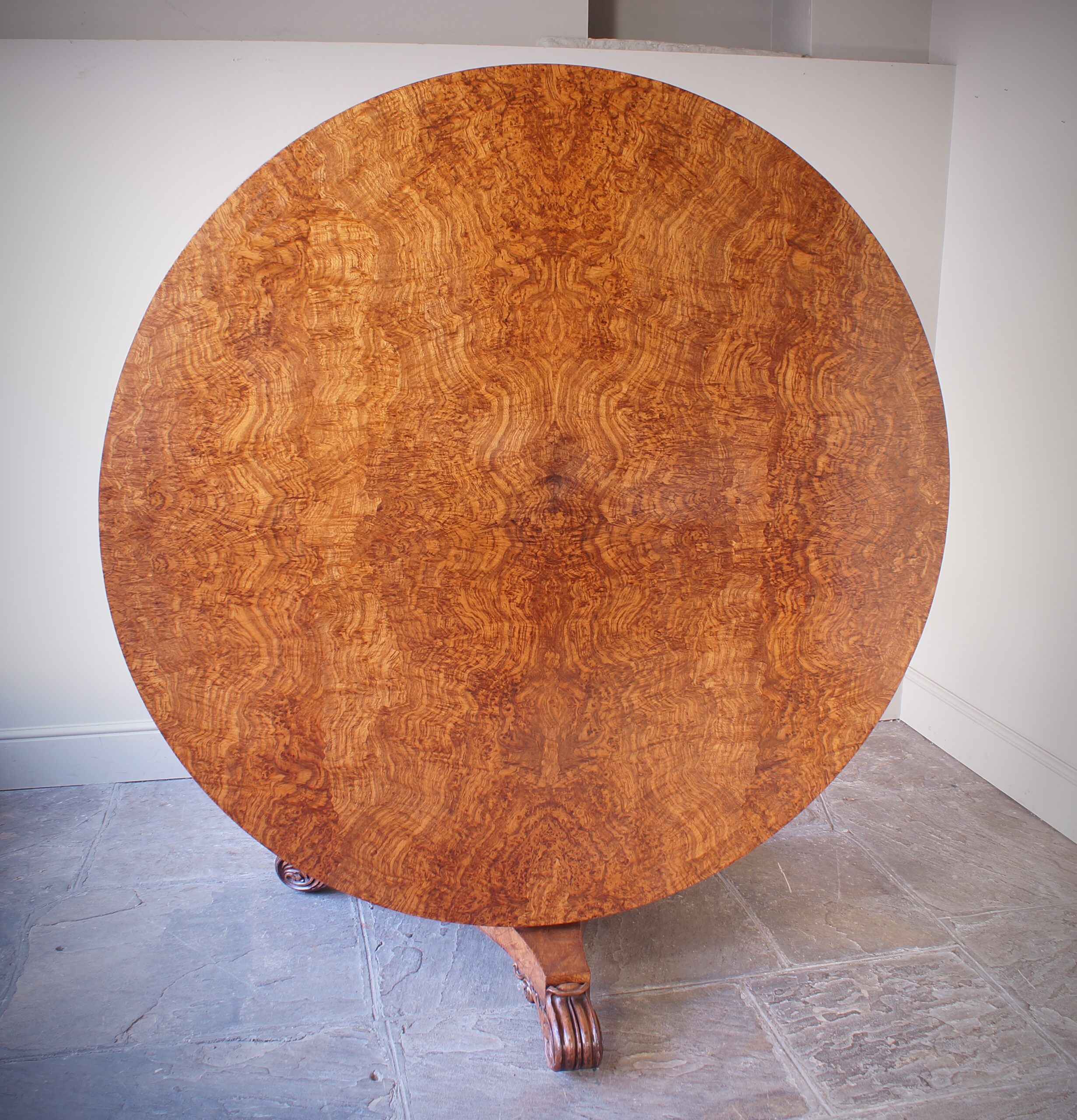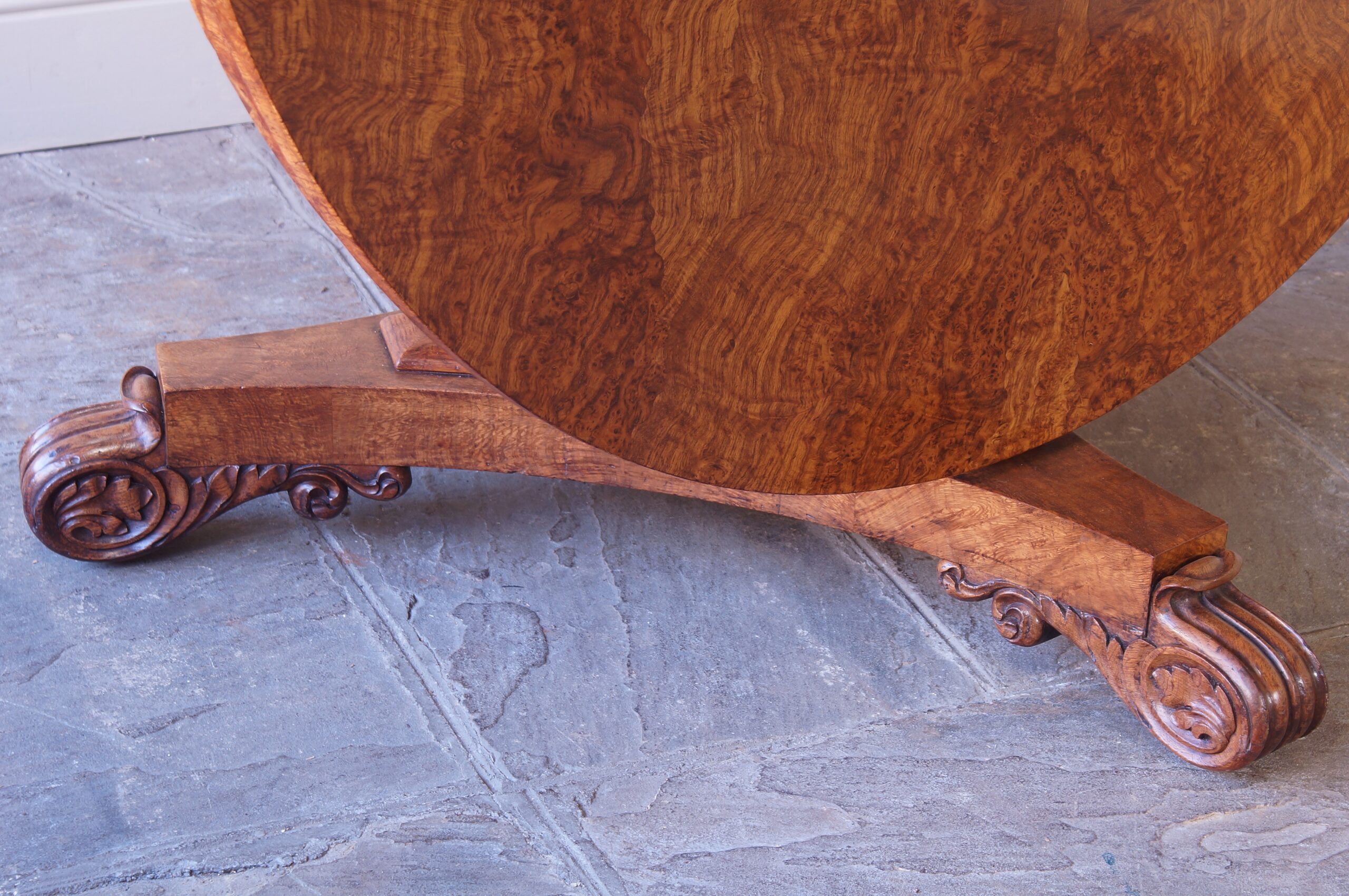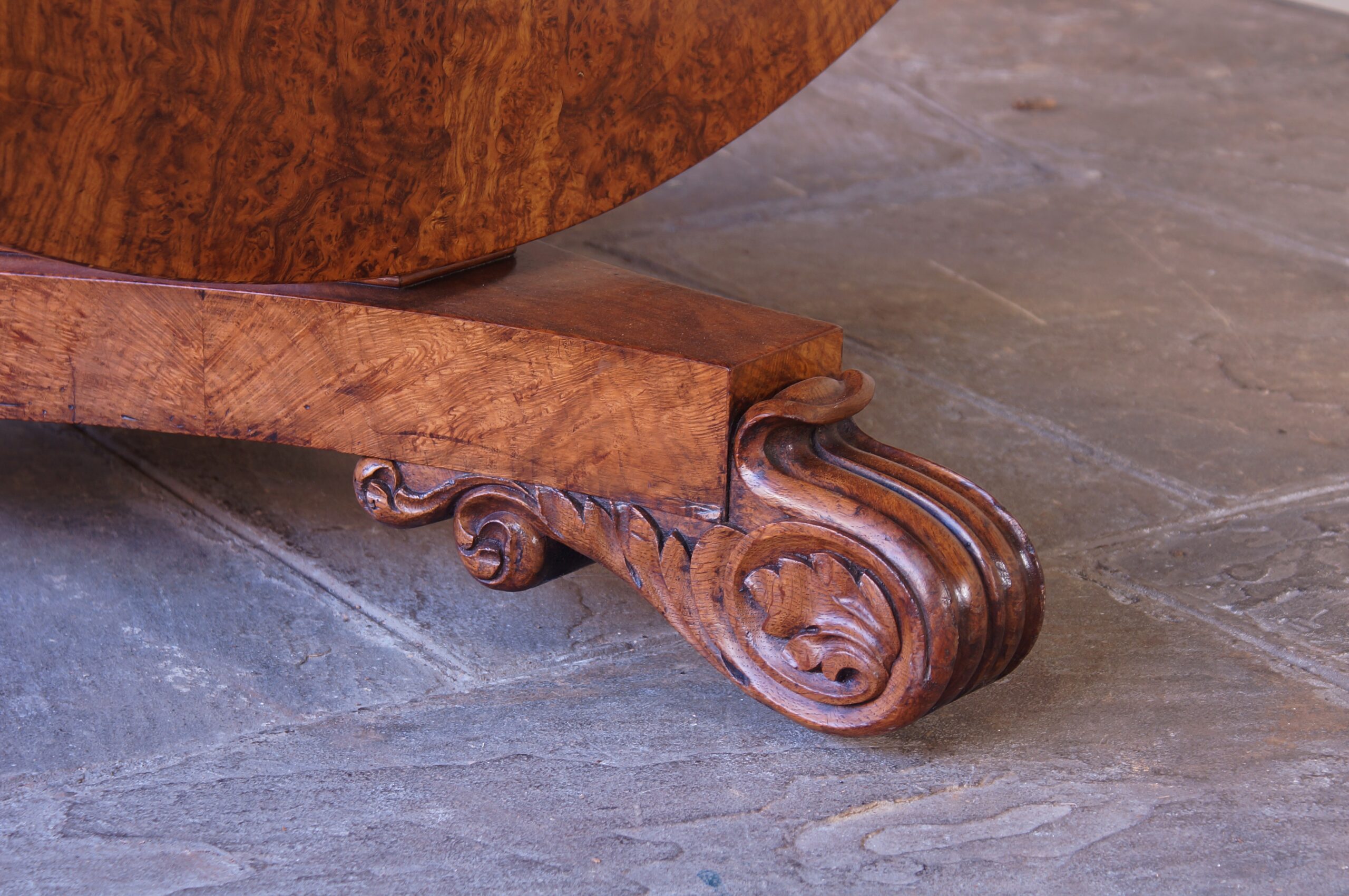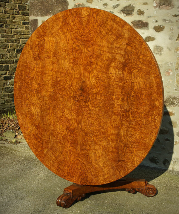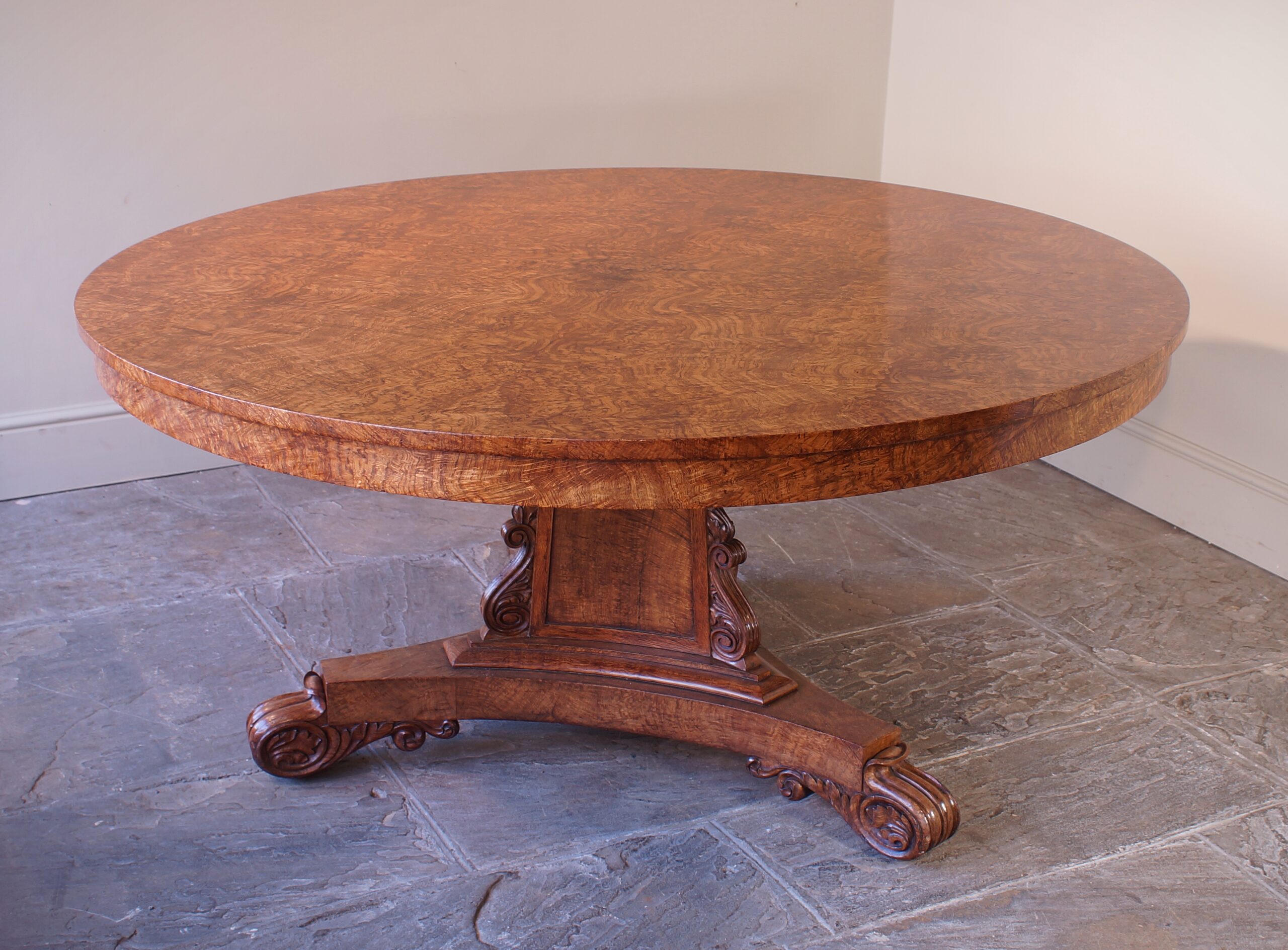 This exceptional 19th Century oak centre table boasts a wonderfully figured circular tilt top raised on a triform base with scroll feet and countersunk castors. Pollard Oak has been masterfully employed to create a striking visual effect on this substantial Regency centre table. Conceived in the Greek Revival style popularised by Thomas Hope and championed by George Smith, this table exhibits a refined form that places emphasis on the highly decorative native veneers.