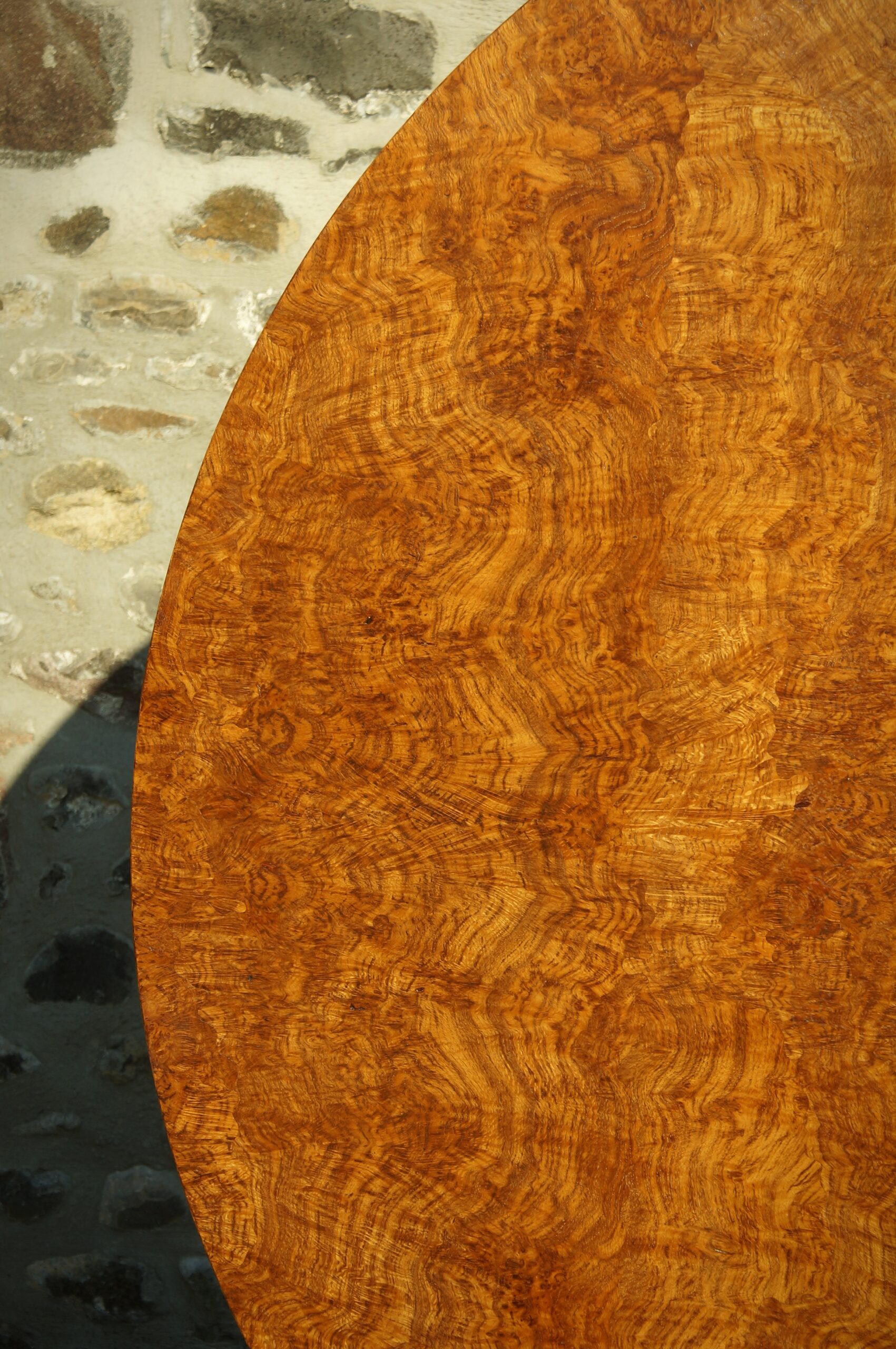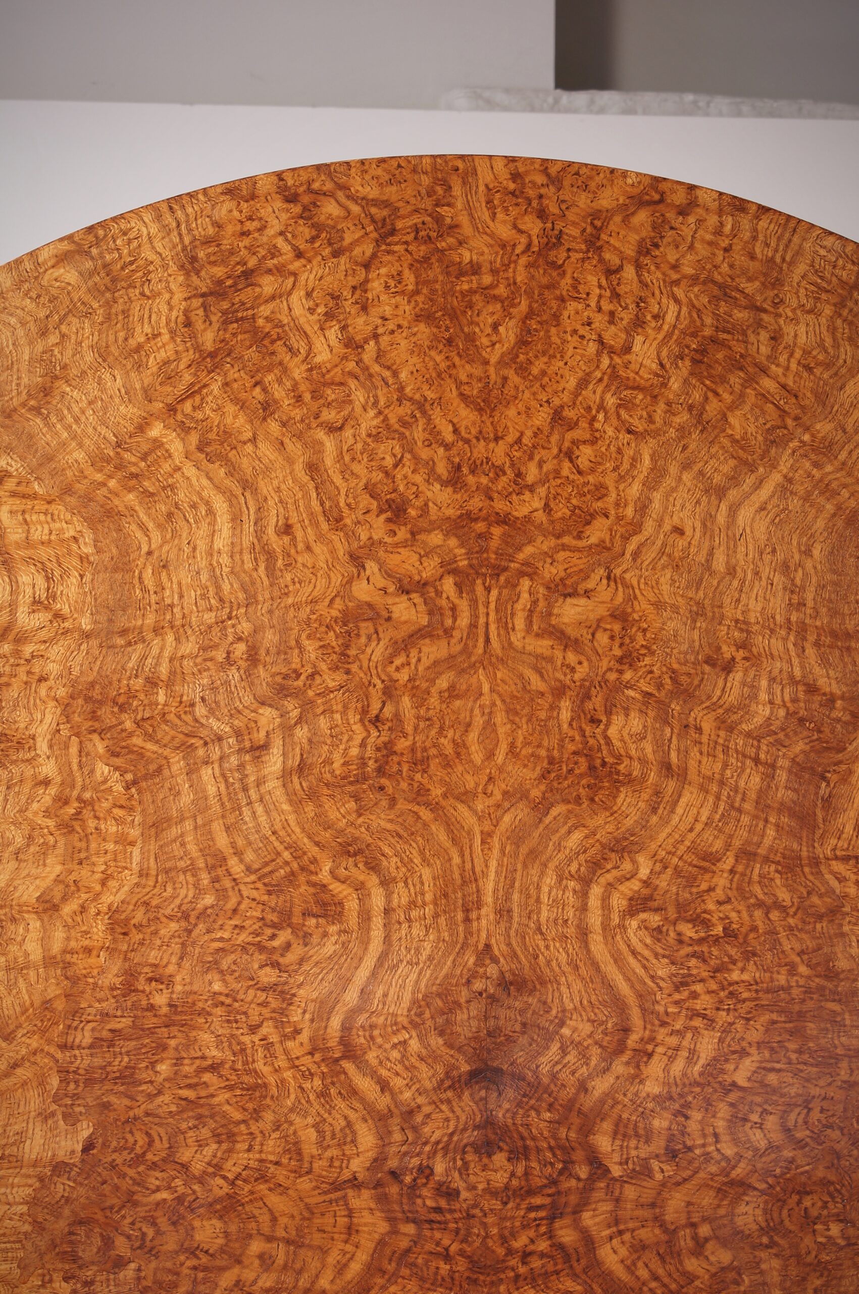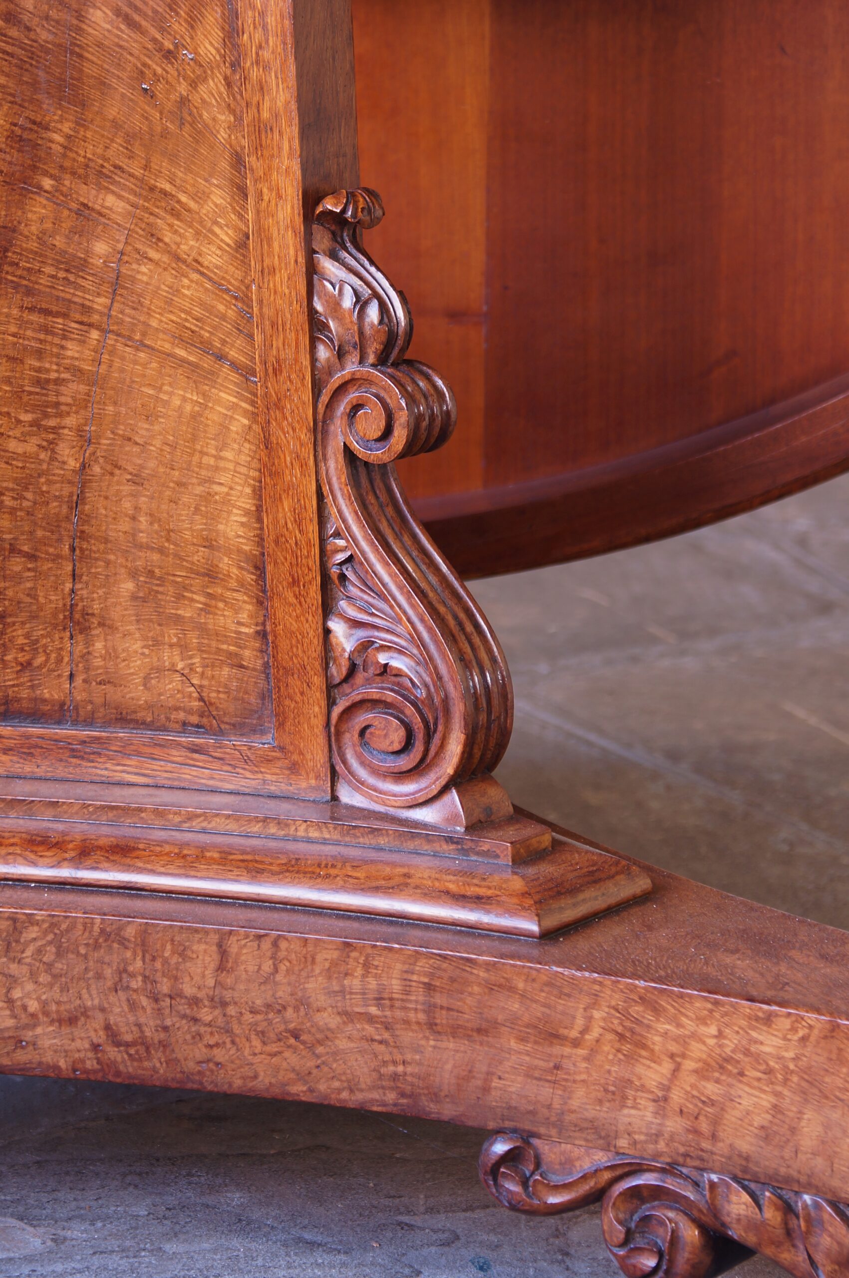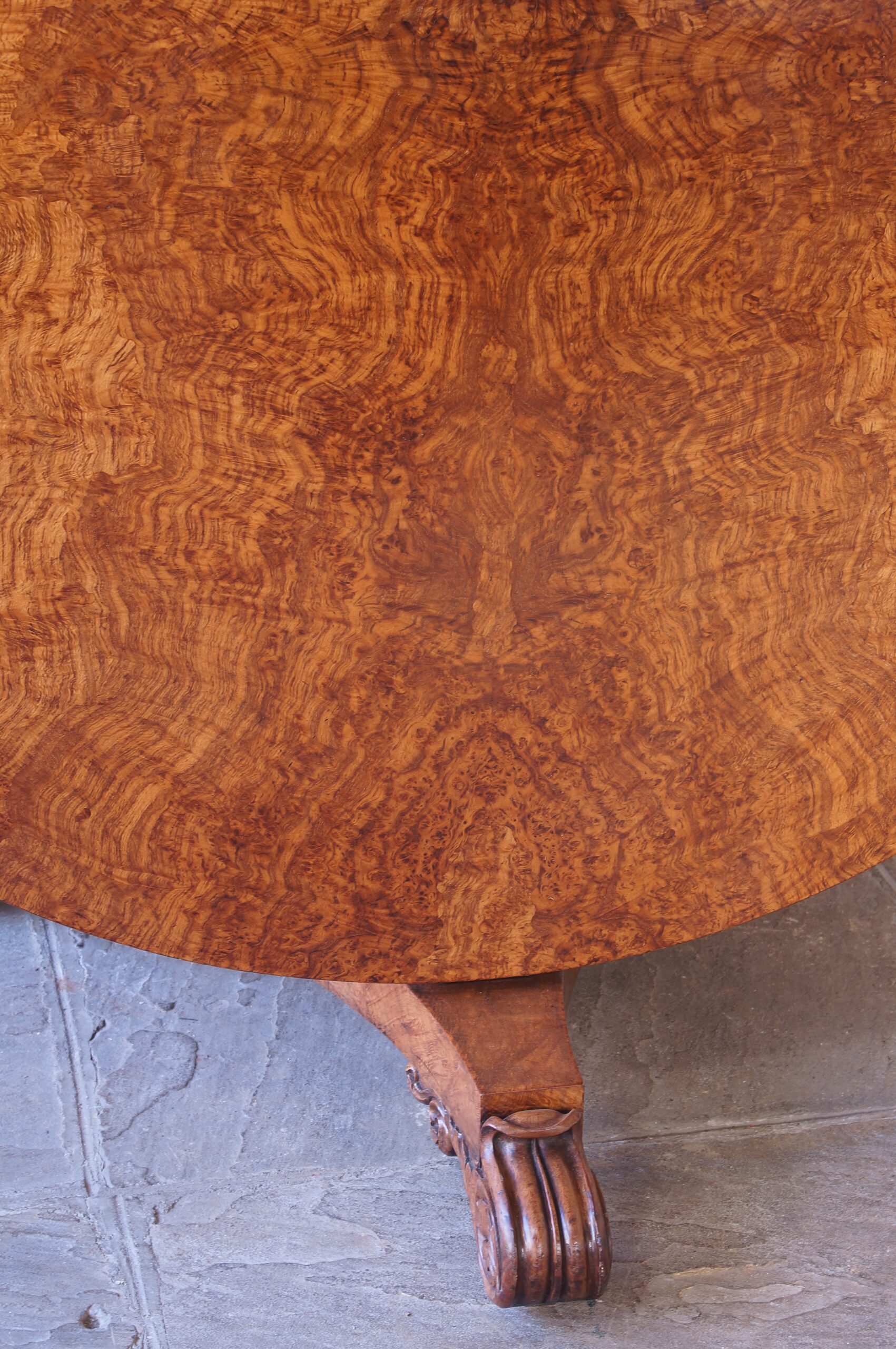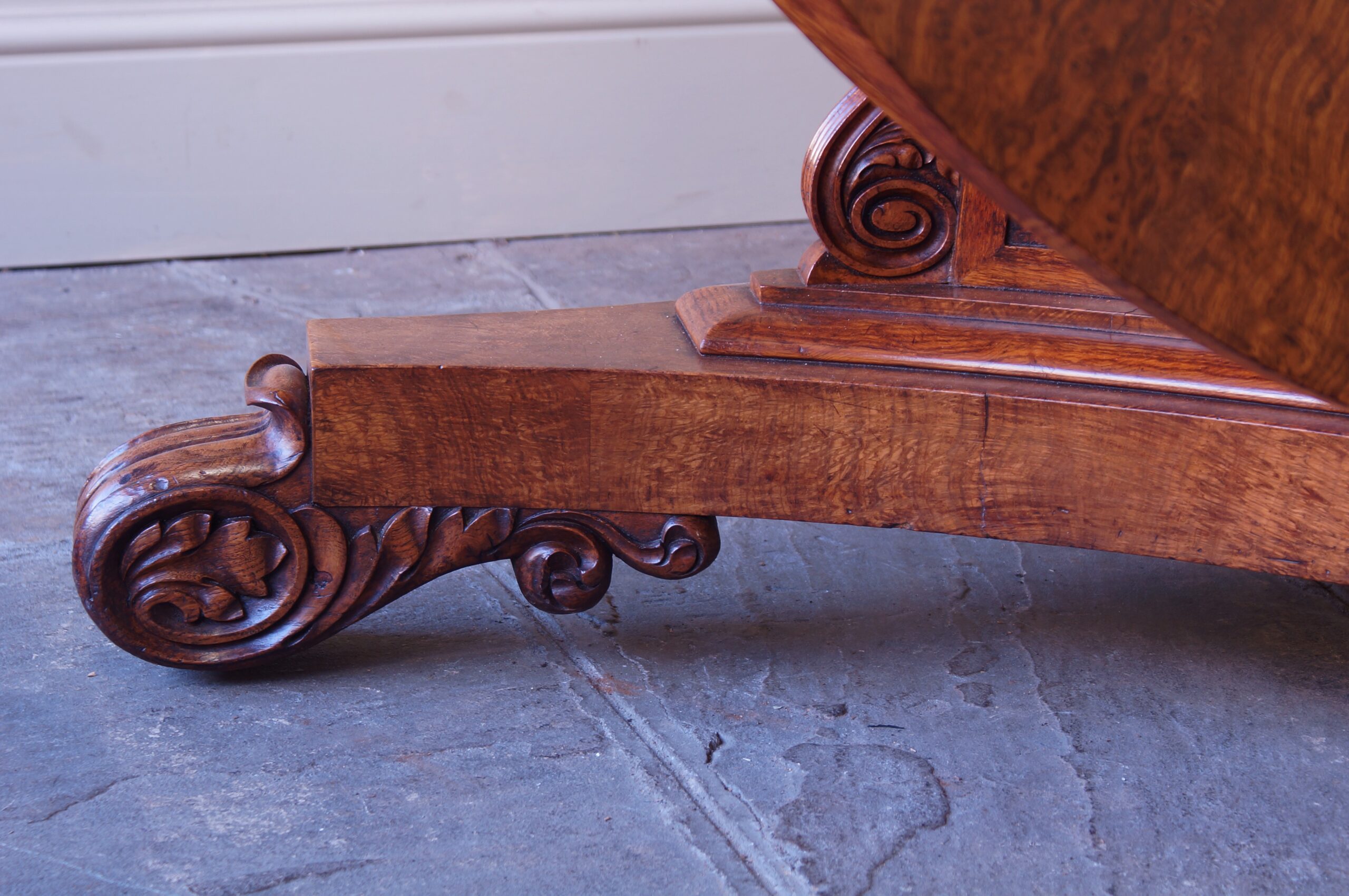 This exceptional 19th Century oak centre table boasts a wonderfully figured circular tilt top raised on a triform base with scroll feet and countersunk castors. Pollard Oak has been masterfully employed to create a striking visual effect on this substantial Regency centre table. Conceived in the Greek Revival style popularised by Thomas Hope and championed by George Smith, this table exhibits a refined form that places emphasis on the highly decorative native veneers.