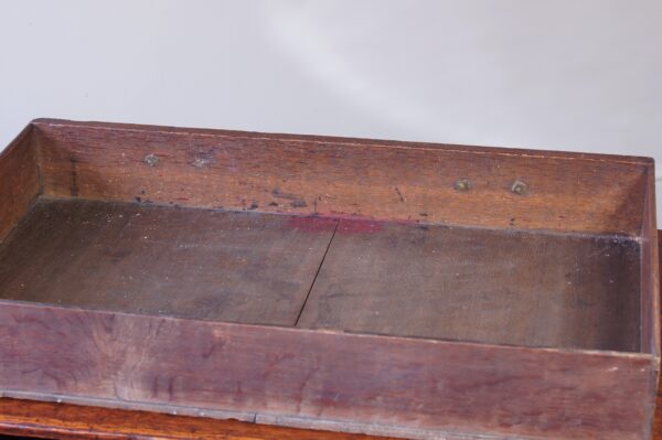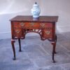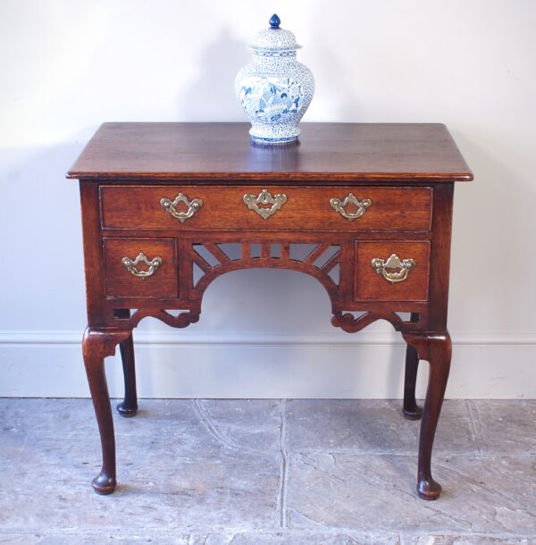 A small George II Oak Lowboy in very good original condition and retaining the original pierced brass handles. This is a well proportioned example having three cock beaded drawers and a boldly shaped and pierced freeze. Standing on fine cabriole legs with shaped ear pieces.