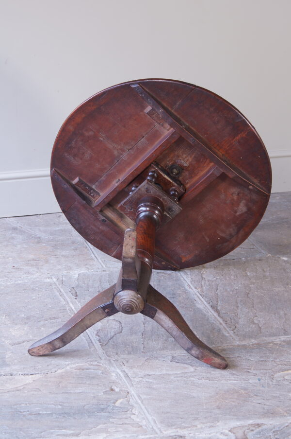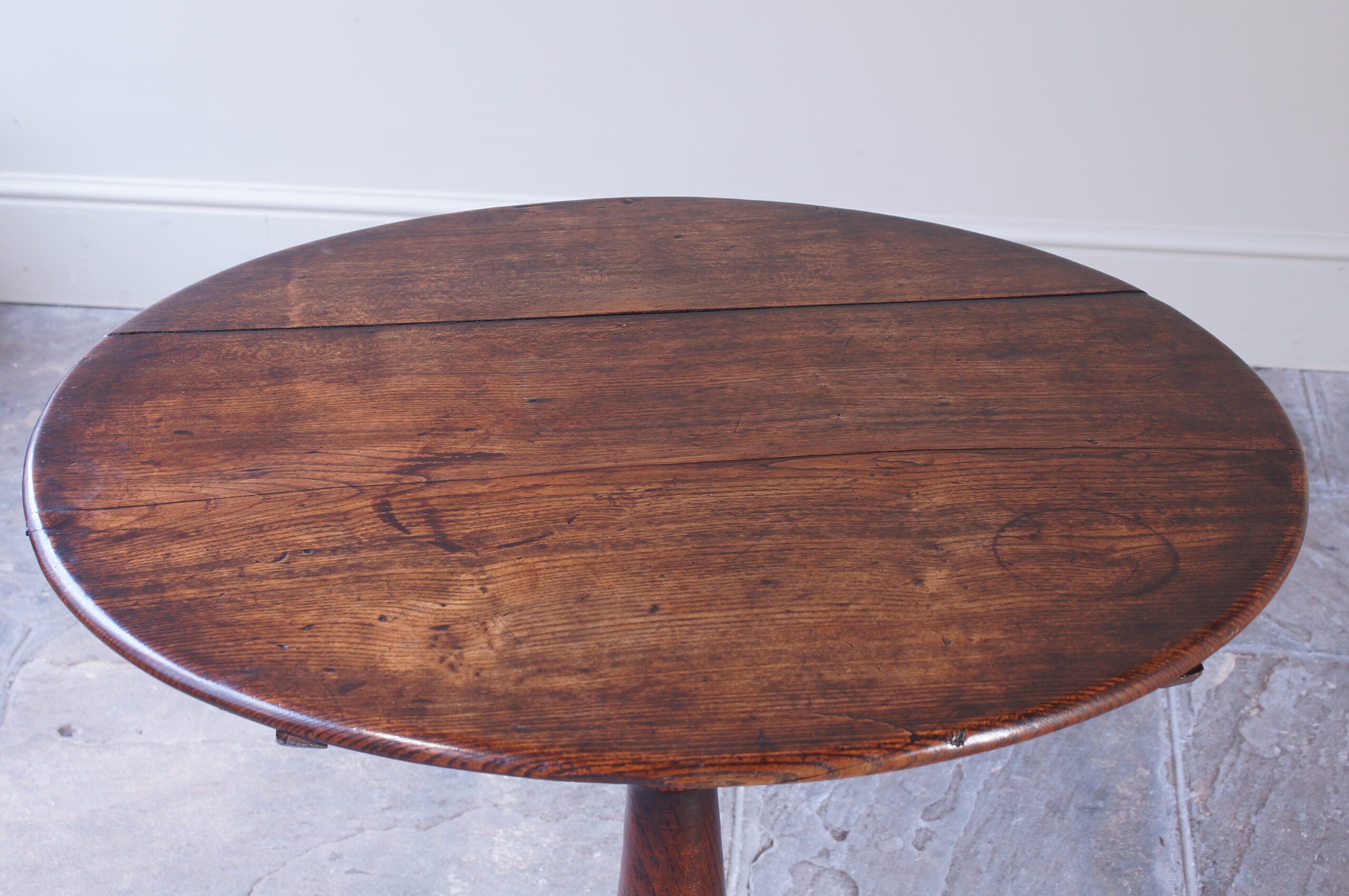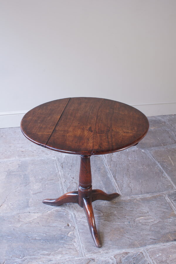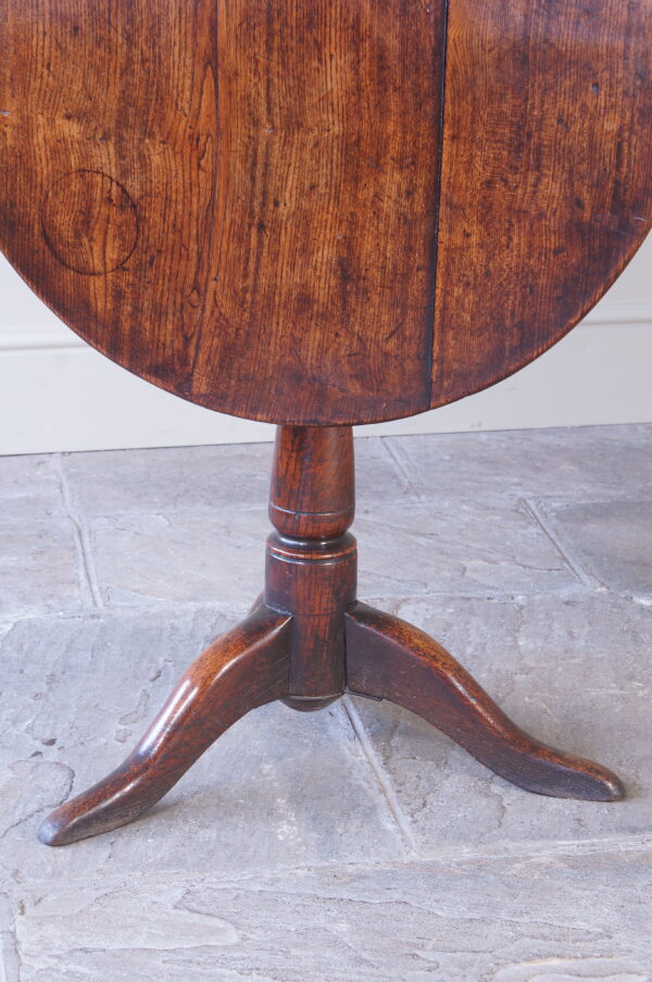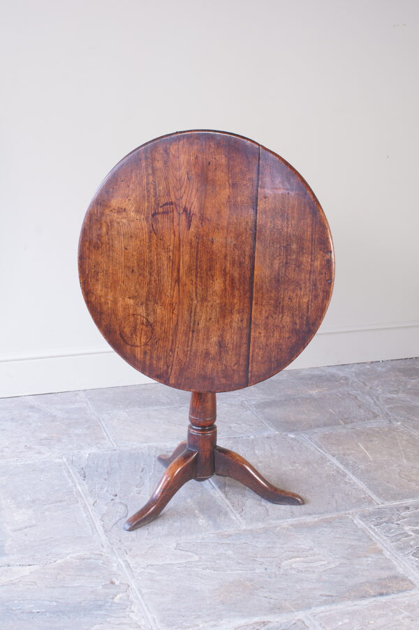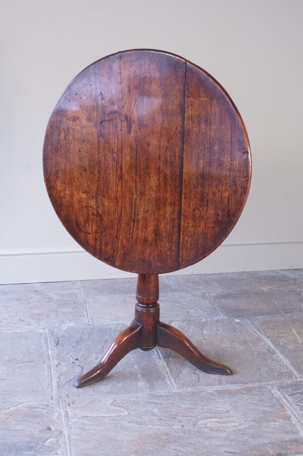 A rare 18th Century Country Elm Tripod Table with bird cage action. With a two piece top, turned stem and unusual shaped legs and to the base.