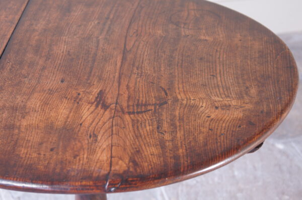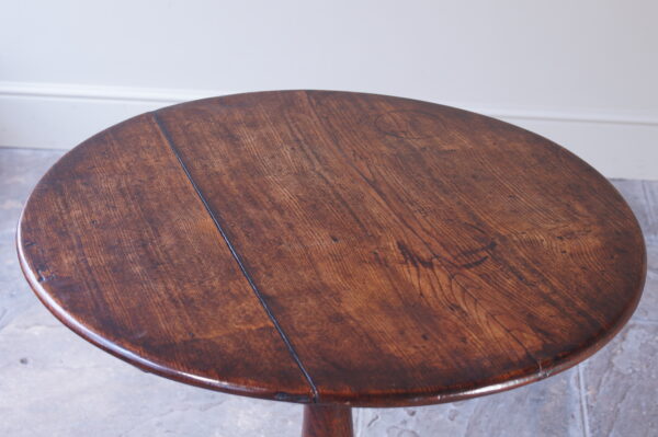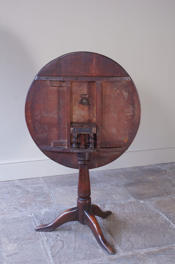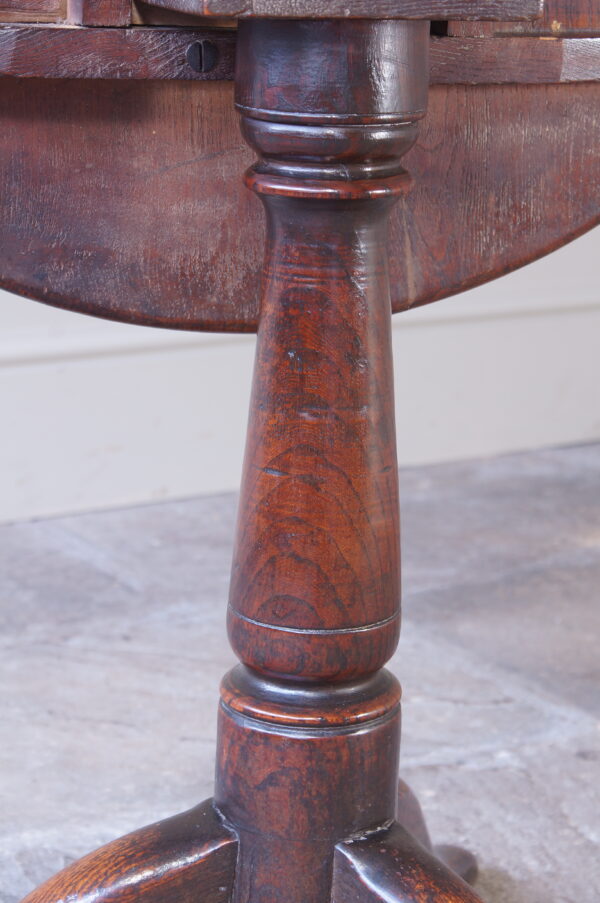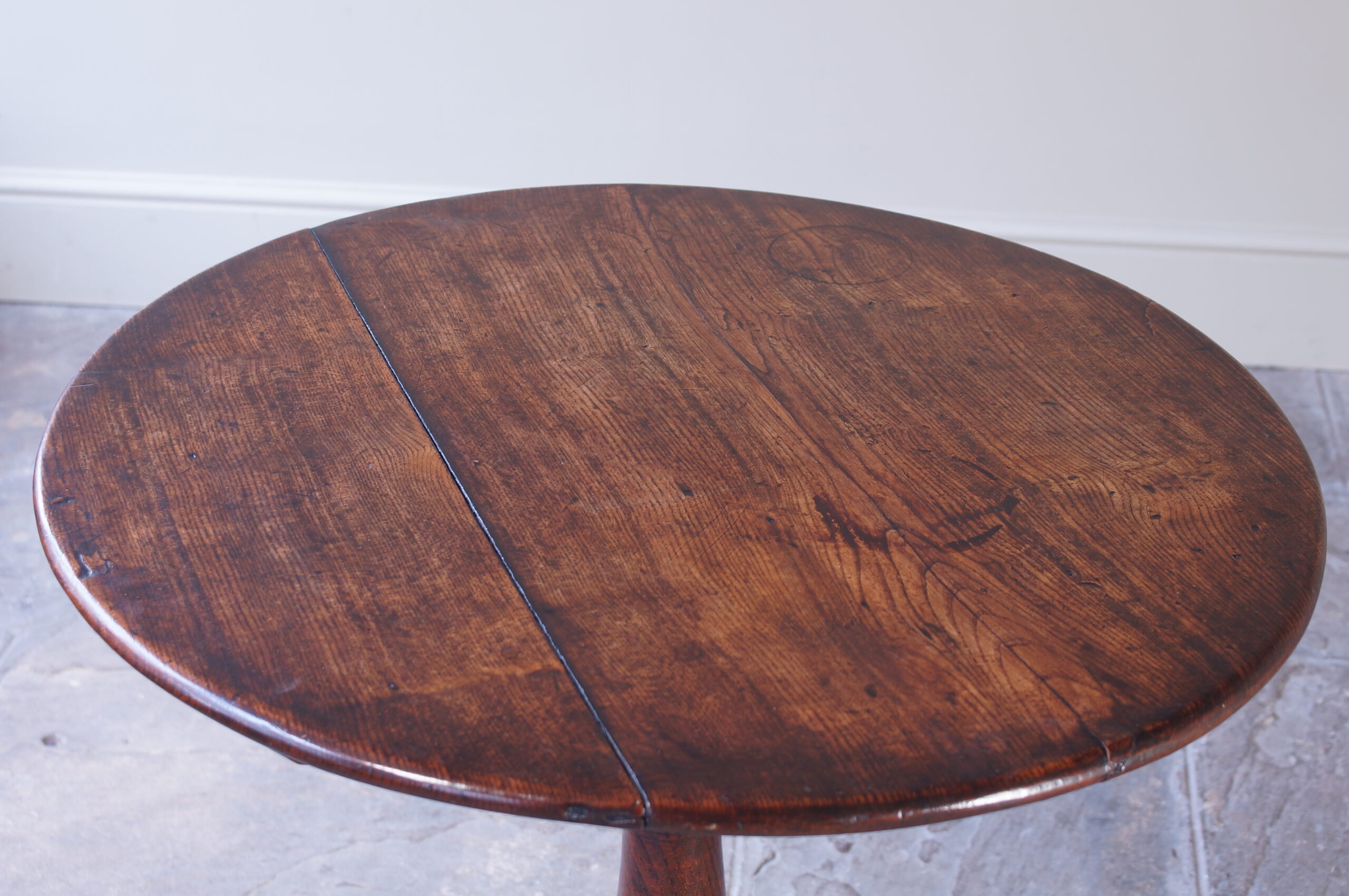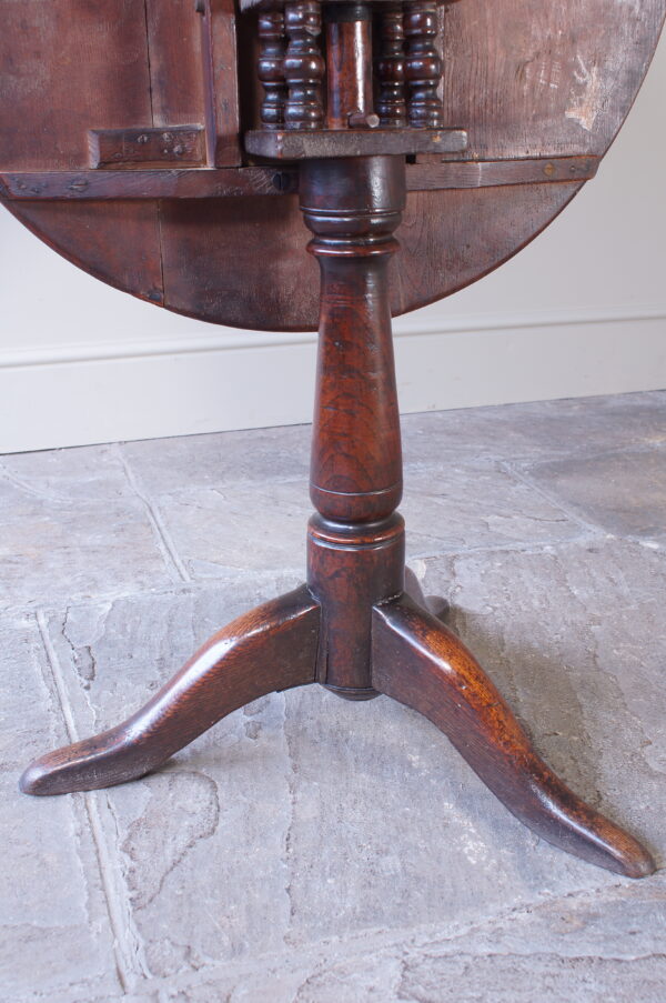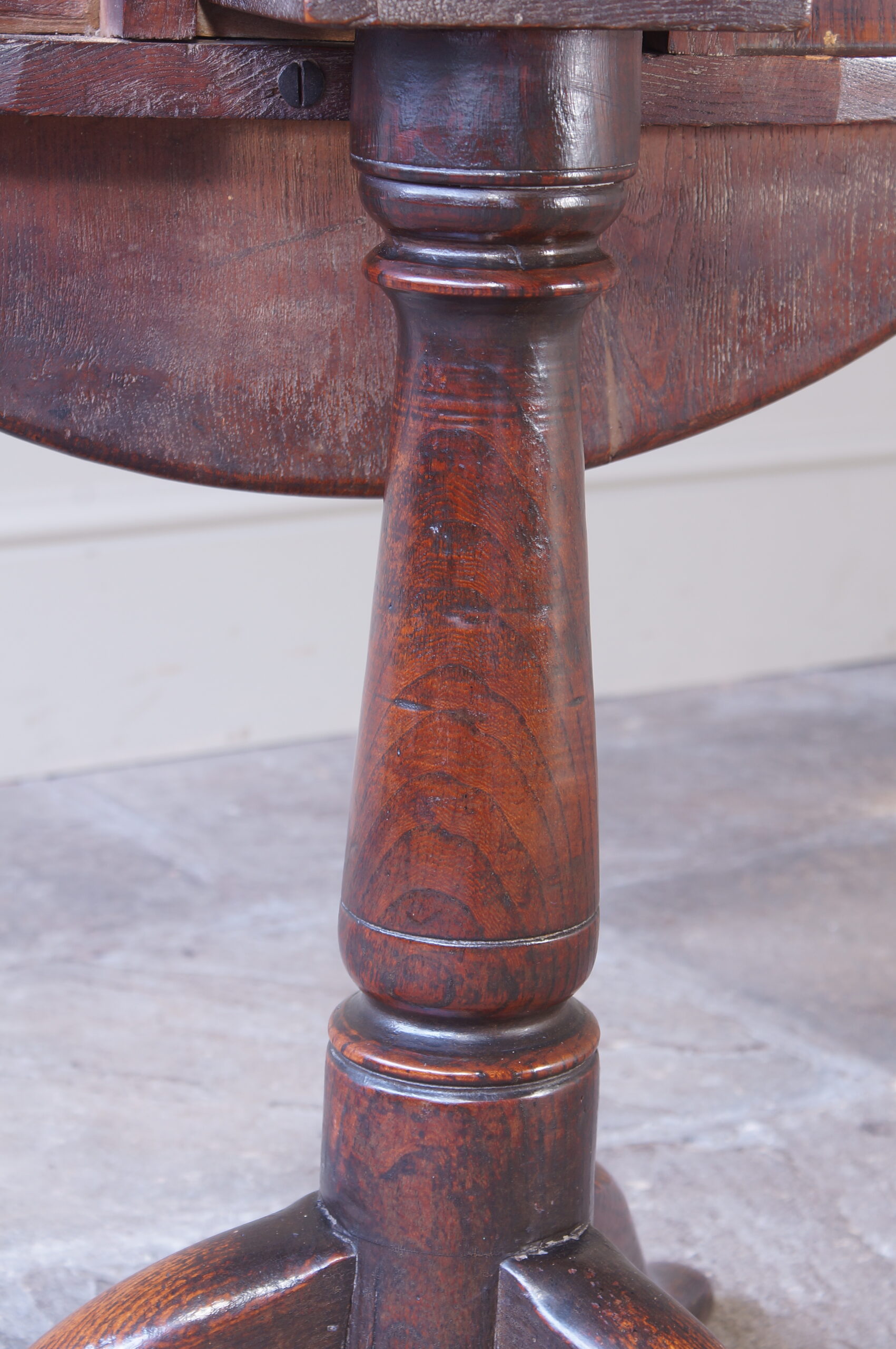 A rare 18th Century Country Elm Tripod Table with bird cage action. With a two piece top, turned stem and unusual shaped legs and to the base.